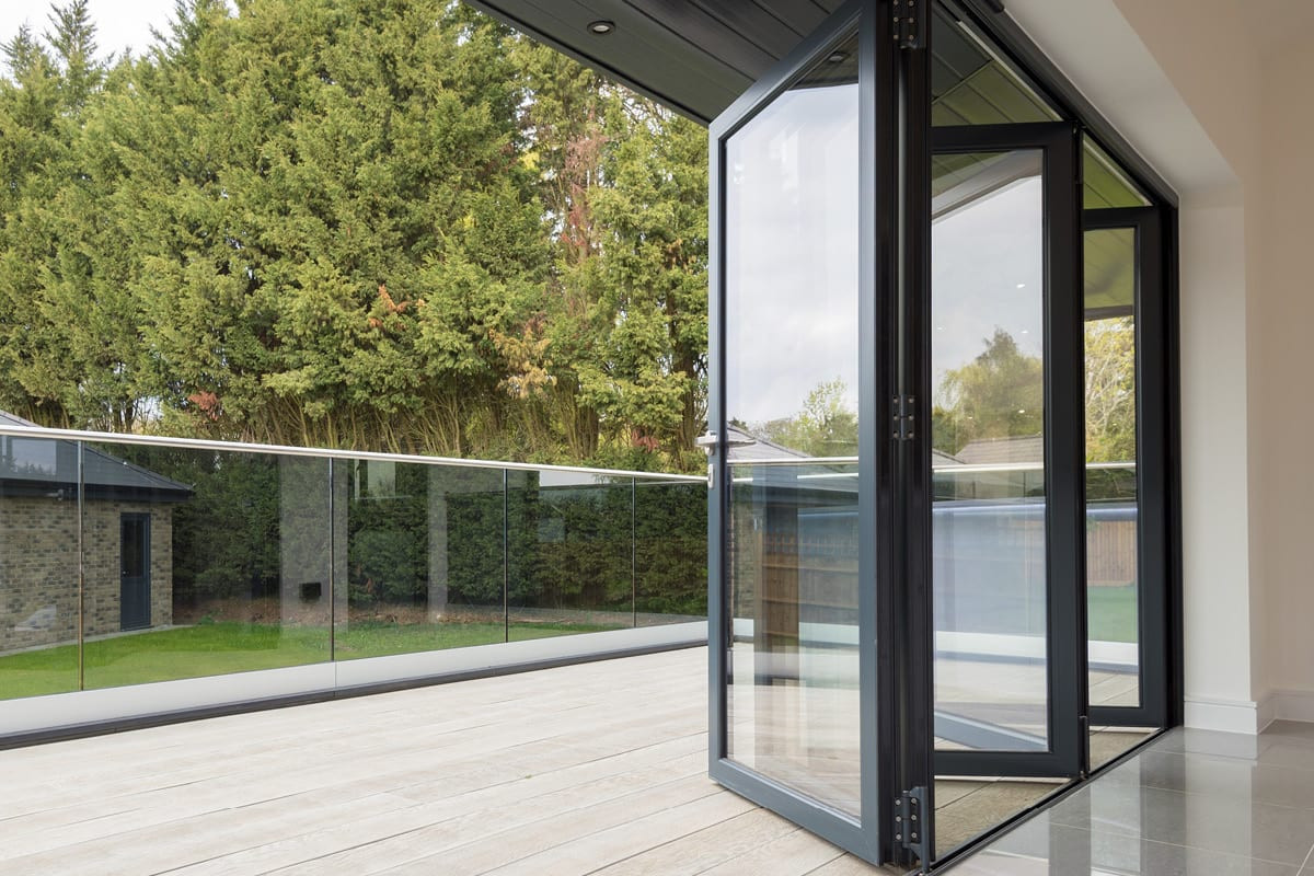 Cửa trượt hướng biển cần kính dán cường lực dày 13.52–17.52 mm, kết hợp khung nhôm hệ chịu lực và ray trượt inox 316 để đảm bảo vận hành ổn định trong gió mạnh.
