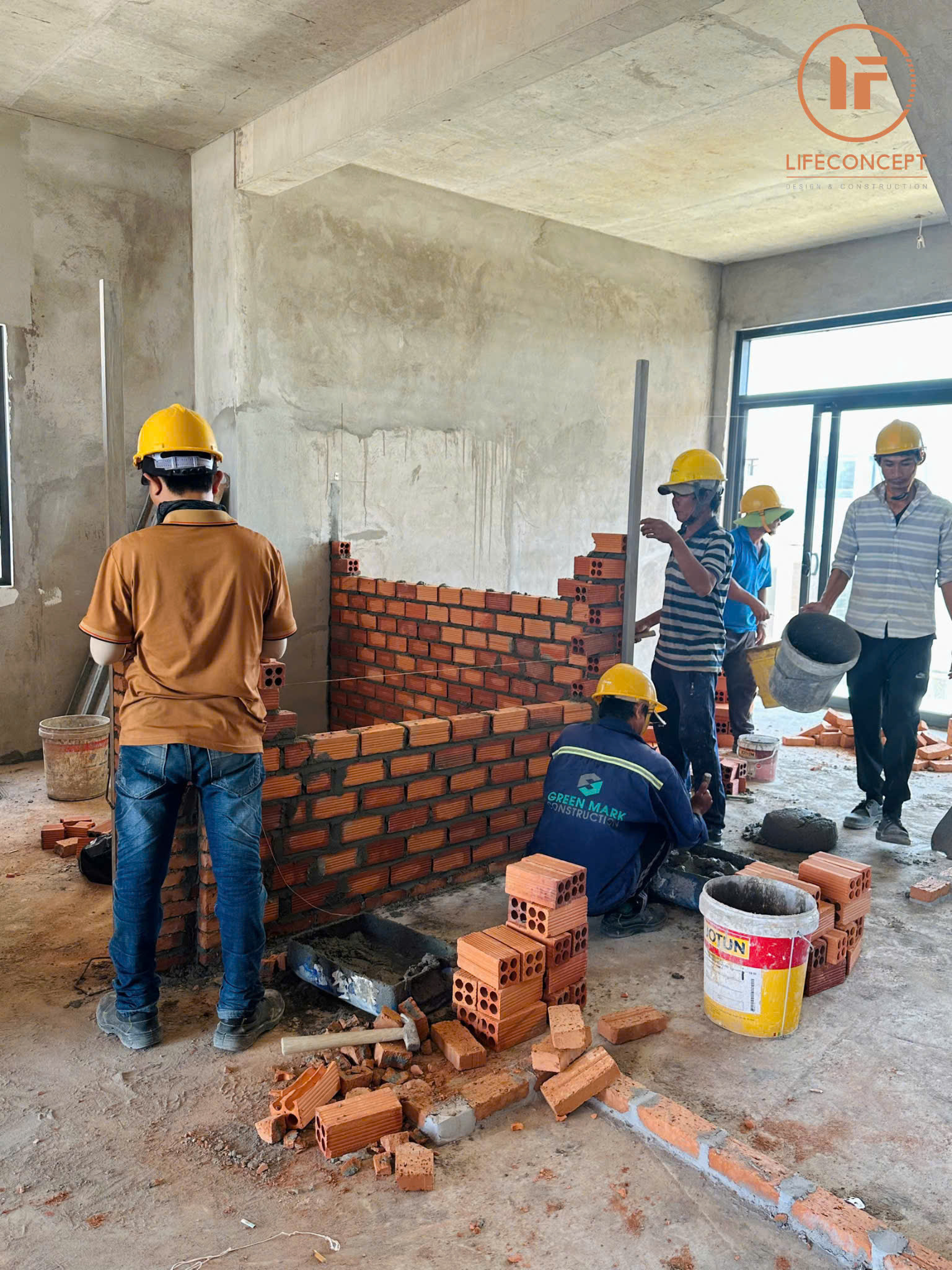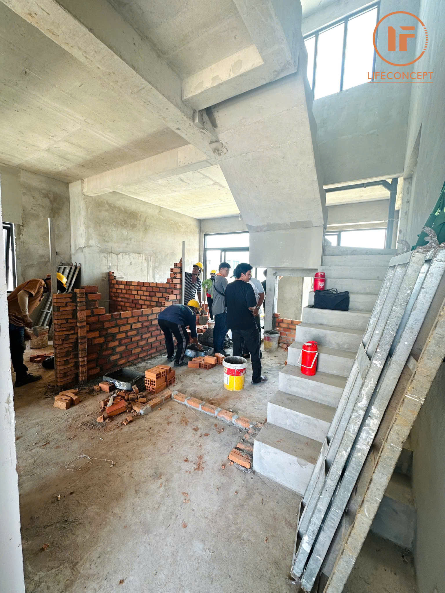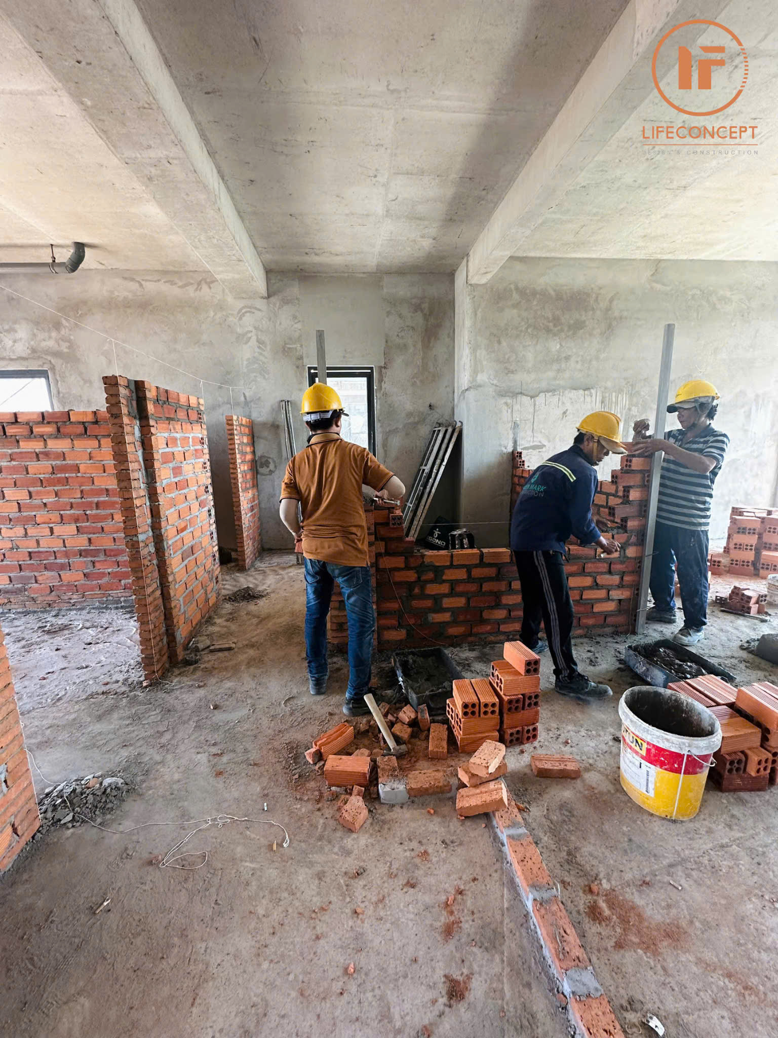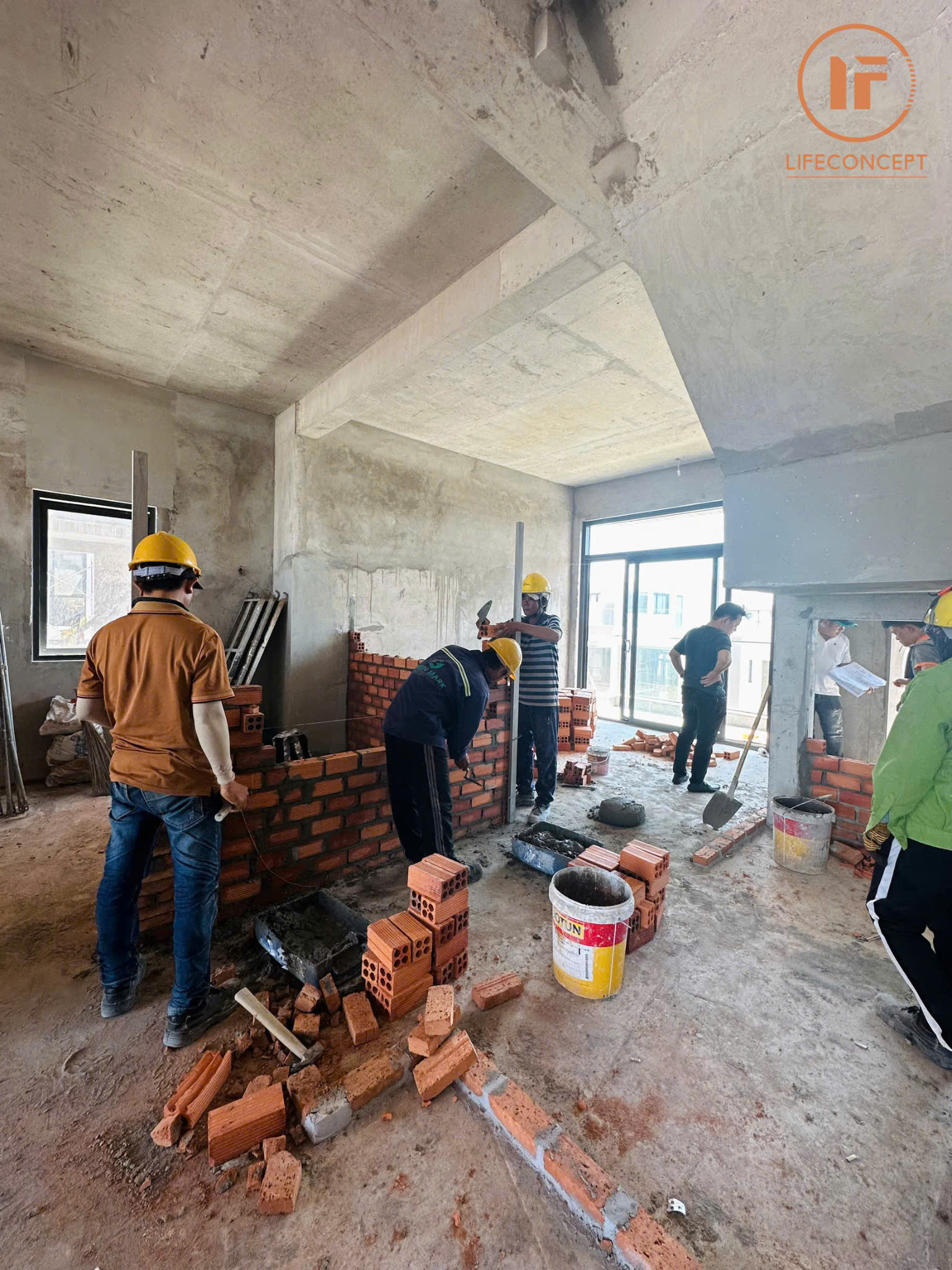 (Gợi ý ảnh 10: Ảnh đội ngũ thiết kế và thi công LIFECONCEPT đang làm việc tại công trình, thể hiện sự chuyên nghiệp và tận tâm) [ALT TEXT: doi ngu thiet ke thi cong noi that