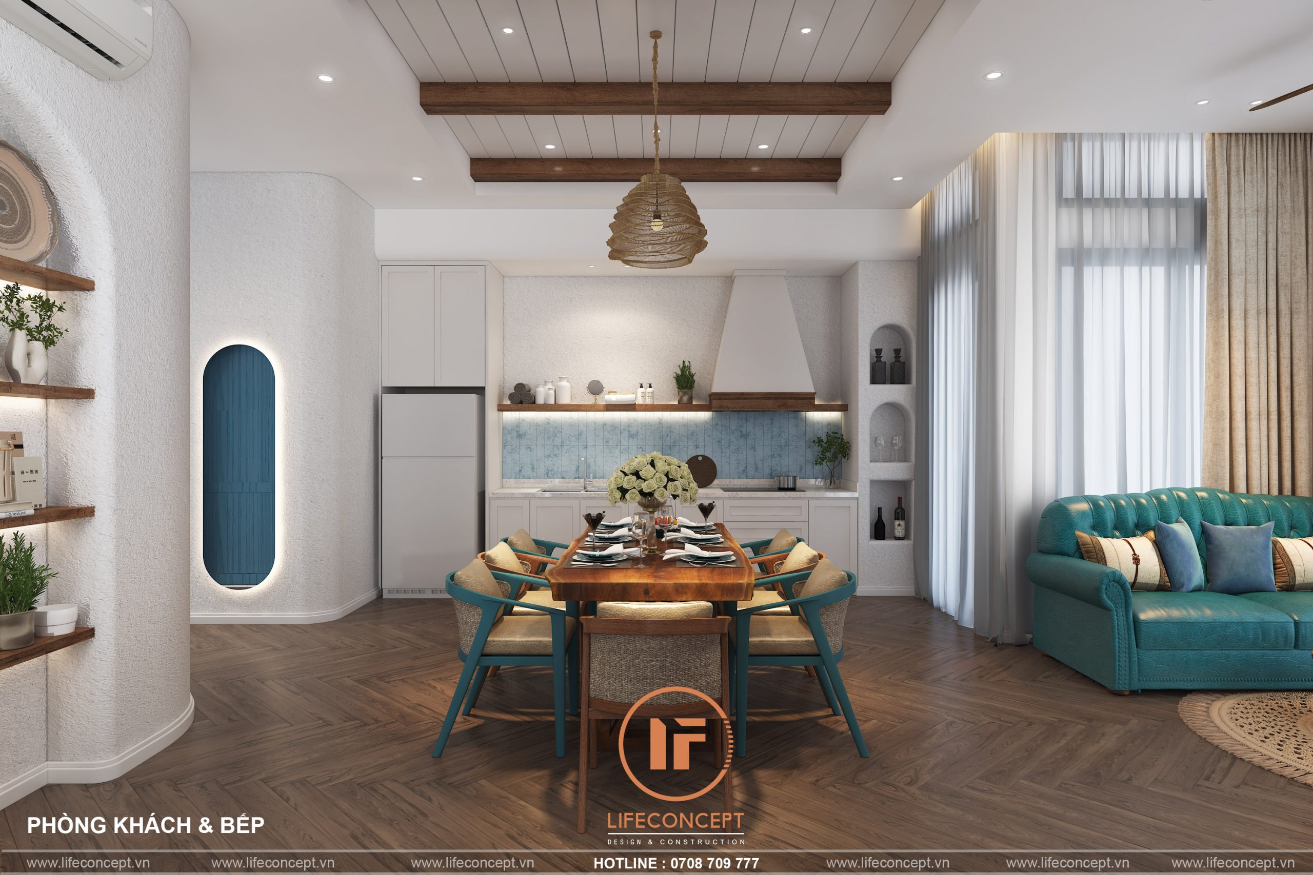 - Không gian dining: bàn dài, ánh sáng CRI cao, tạo cảm giác ấm cúng cho buổi tối bên biển.